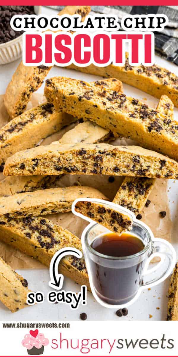 This crunchy, twice baked Chocolate Chip Biscotti is an Italian favorite! My easy to follow recipe is loaded with mini chocolate chips and makes the perfect breakfast cookie, especially when dunked in coffee!