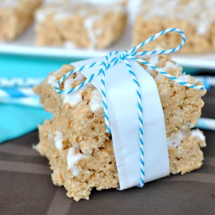 So it made perfect sense to combine all the great flavors of Cinnamon Rolls with the ease of a Rice Krispie Treats recipe. These have a touch of cinnamon sugar folded into the cereal plus a simple glaze with even more cinnamon!