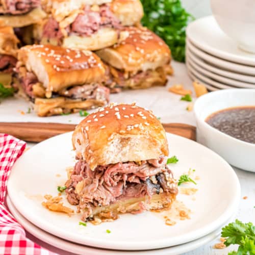 You can assemble the sliders in the baking dish, but hold off on the au jus coating until right before you bake the sandwiches. With the sliders assembled, cover the baking dish and store in the fridge for 1-2 days until you’re ready to bake. Then, whip up the au jus, coat the sliders and continue as usual.