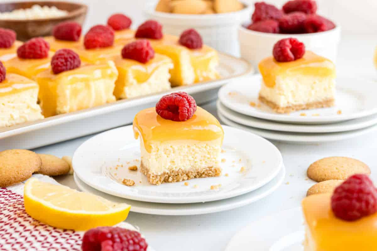Lemon Raspberry Cheesecake bites are creamy, tangy, and perfectly sized. Made with a buttery cookie crust, creamy filling, lemon curd topping, and a colorful raspberry!