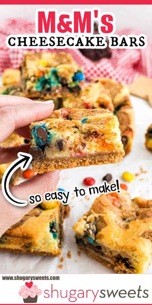 M&Ms make an ideal addition to so many sweet treats. M&M’S Cookie Bars meets Cheesecake Bars in this unbelievably delicious recipe. Be sure to scroll down to the recipe card for a complete list of ingredients with measurements.
