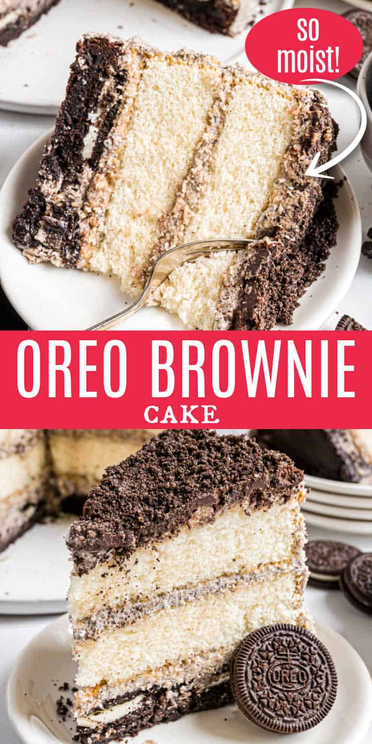 Oreo Brownie Cake is a decadent treat with three layers! Starting with a brownie base and topped with two layers of white cake, this cake is covered with Oreo frosting and chocolate ganache!