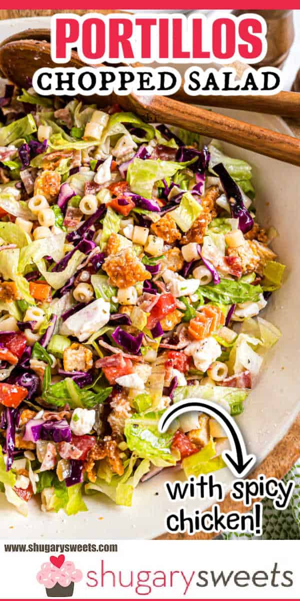 This copycat Portillo’s Chopped Salad recipe is made with a zesty dressing, bacon, veggies, and spicy chicken. The ditalini pasta is what made this salad famous at Portillo’s in Chicago.