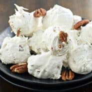 Once it’s properly beaten, fold in chopped pecans and spoon (I use a heaping tablespoon) onto your parchment paper lined baking sheets. Allow about an hour or two to set. Store in tightly covered container at room temperature. ENJOY
