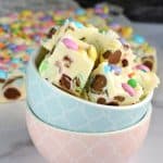 Add candies and fold them in with a spoon, gently. Pour mixture into prepared baking dish. Immediately top with sprinkles (and any extra candies you would like). Allow to set at room temperature for two hours (or overnight), covered with a piece of plastic wrap.