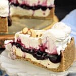 Carefully spoon one can of thick, blueberry pie filling onto the top of the cheesecake layer. I used the entire can, but if you want a little less, feel free to not use it all (and save the blueberry pie filling to go on top of some ice cream later!