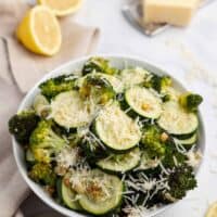 Crisp pieces of roasted broccoli and roasted zucchini covered in garlic and Parmesan cheese make for a glorious side dish. This easy to make and kid-friendly Roasted Broccoli and Zucchini recipe deserves a spot on your dinner table!