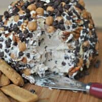 In a bowl, combine remaining 1/4 cup chocolate chips, pecans and caramel bits. Unwrap cheeseball and roll into bowl of chocolate chip mixture. Press toppings gently into the cheeseball.